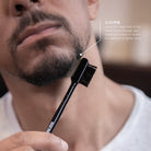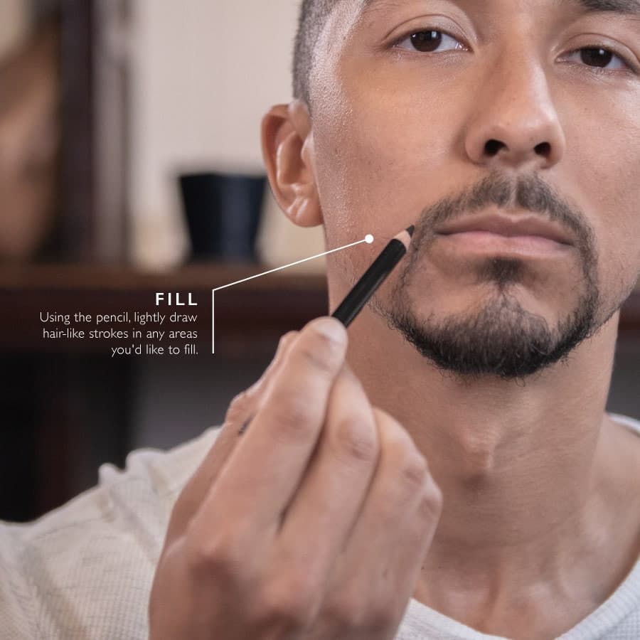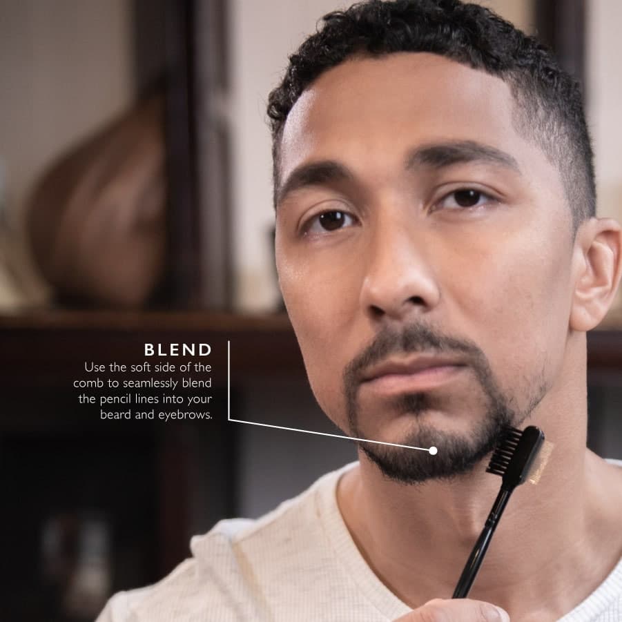 Using the soft side of the attached comb, blend the pencil lines into your beard and eyebrows.