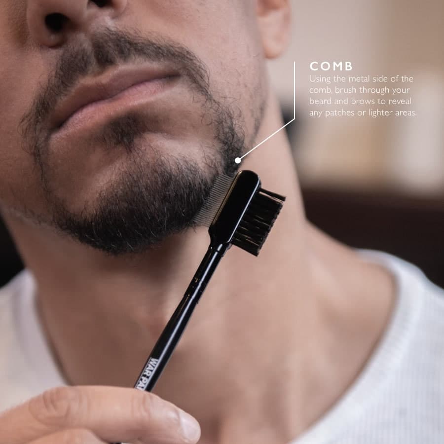 Using the metal side of the attached comb, brush through your beard and brows to reveal any patches or lighter areas.